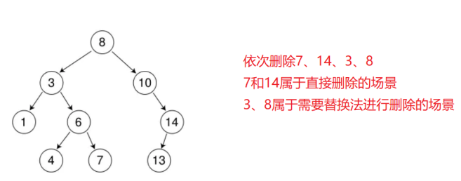 情况d:在它的右子树中寻找中序下的第一个结点(关键值最小),用它的值填补到被删除结点中,再来处理该结点的删除问题---替换法删除。