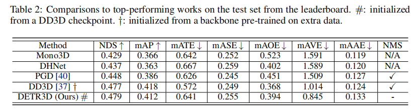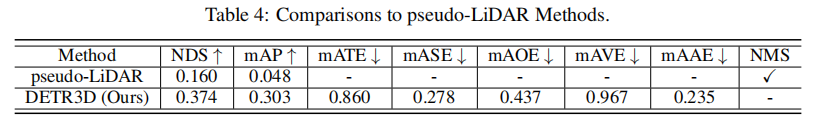 - 即使不使用 NMS 后处理,DETR3D 的基础版本(DETR3D (Ours))NDS 达到 0.374,与使用 NMS 的 FCOS3D(0.373)相当;
