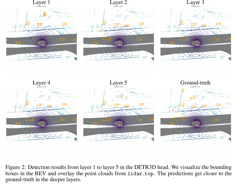 DETR3D 不依赖激光雷达点云,仅通过上述输入预测 3D 边界框和类别标签。