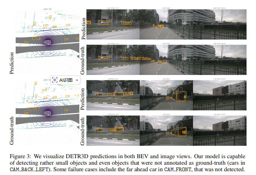 图 3 展示了 DETR3D 在 BEV 视角和 6 个相机图像视角下的预测结果。模型能够检测到相对较小的目标,甚至部分未标注的目标(如左后相机中的车辆)。但定性结果也反映出模型仍存在一定的平移误差,这与定量实验中 mATE 指标的表现一致,表明深度估计仍是该问题的核心挑战,即使 DETR3D 避免了显式深度预测。