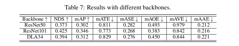 表 7 对比了不同骨干网络对 DETR3D 性能的影响。ResNet101 作为骨干网络时性能最优(NDS=0.425,mAP=0.346),优于 ResNet50 和 DLA34,表明更强大的特征提取能力有助于提升 3D 检测性能。