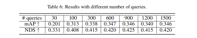 表 6 展示了不同目标查询数量对性能的影响。随着查询数量增加,mAP 和 NDS 逐步提升,在 900 个查询时达到饱和(mAP=0.346,NDS=0.425),继续增加查询数量性能无明显提升甚至略有下降。这一结果为模型参数选择提供了参考。