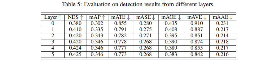 表 5 展示了不同检测头层数对性能的影响。随着层数增加,模型性能逐步提升,在第 5 层(最后一层)达到最优:NDS=0.425,mAP=0.346。图 2 可视化了各层目标查询优化后的边界框预测结果,深层网络的预测更接近真实框,证明迭代优化对充分发挥架构优势至关重要。