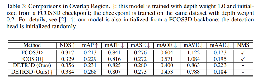 注:‡: 模型以深度权重 1.0 训练,从深度权重 0.2 的 FCOS3D checkpoint 初始化;†: 模型从 FCOS3D 骨干网络初始化,检测头随机初始化。