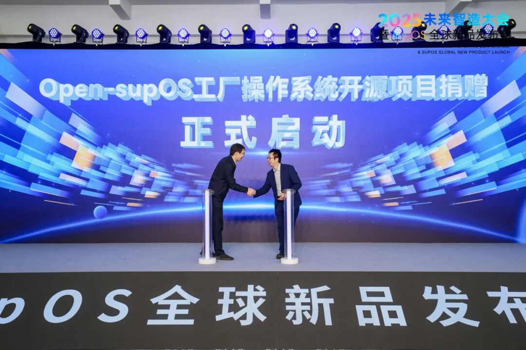 2025未来智造大会暨supOS全球新品发布会现场,蓝卓总裁陈玉龙代表公司,正式启动将Open supOS核心代码捐赠给开放原子开源基金会。