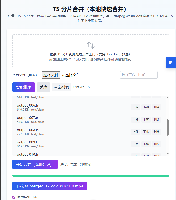 使用流程也极为简洁:第一步,拖拽或点击上传目标TS分片;第二步,通过智能排序或手动调整确认分片顺序;第三步,若分片加密则上传密钥文件并可选填写IV;第四步,点击"开始合并",等待浏览器端完成处理;最后,点击下载即可保存合并后的MP4文件。整个过程一气呵成,无需安装任何客户端软件,打开浏览器即可使用,极大提升了使用场景的灵活性。