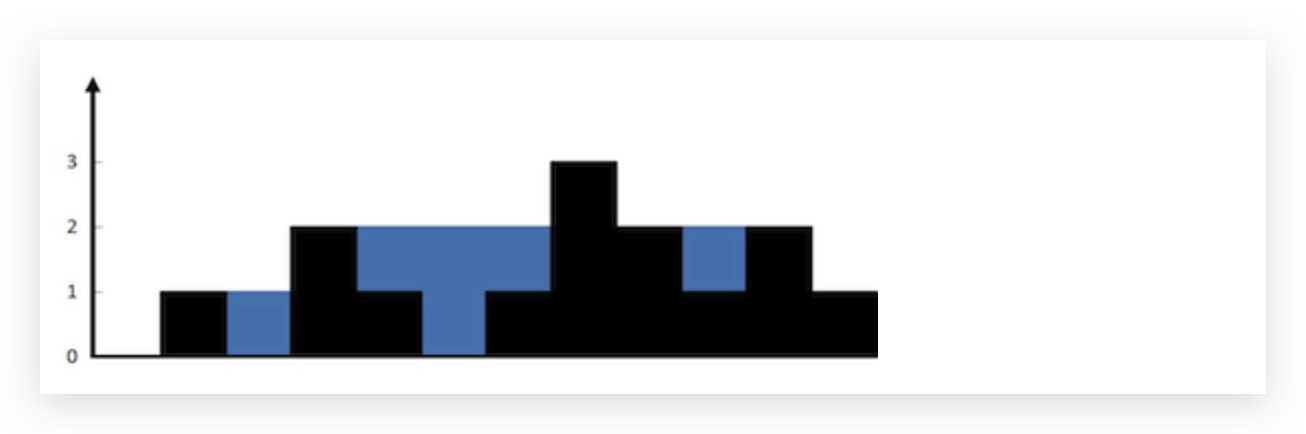 - 解释:上面是由数组 [0,1,0,2,1,0,1,3,2,1,2,1] 表示的高度图,在这种情况下,可以接 6 个单位的雨水(蓝色部分表示雨水)。