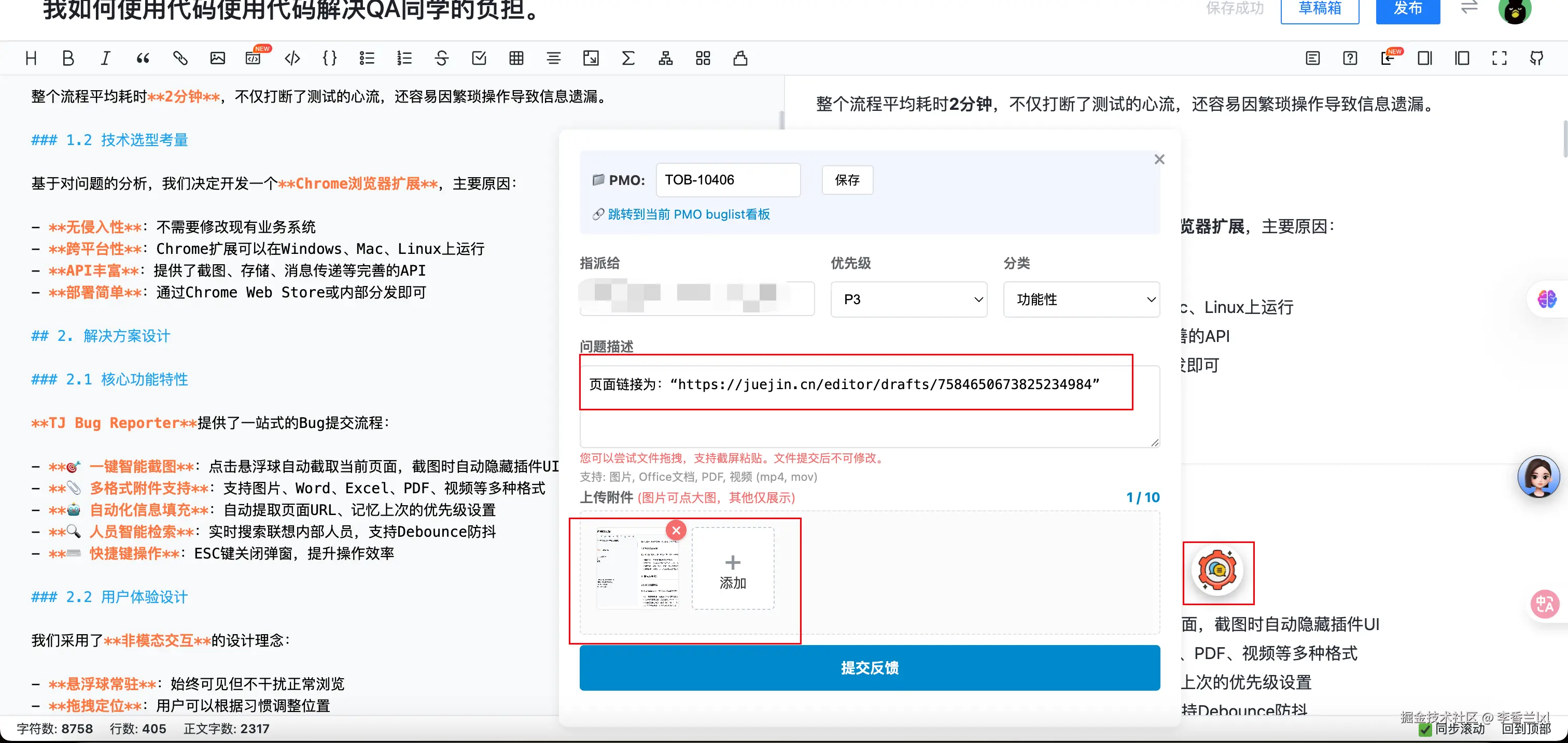 最近在封闭开发过程中发现QA同学只能通过固定页面提交bug。而且需要不断的截图上传,在没有显示器的情况下,无论是切换还是上传对于QA的都作都是一种"不得不做"的时间负担,而且提给我们的bug也没有链接导致无法快速还原和解决。对于前端而言也是一种负担。所以通过开发一个快速bug提交,快速完成页面页面截图,链接收集的方式让QA可以不只在buglist的网站进行提交。有了想法之后交给AI迭代,很快就完成了。下面是一些经验和遇到困难:主要是如何实现快速截图,如何解决插件请求接口的跨域问题,以及如何解决截图样式等。最终写了个文档+插件包提供给QA团队,最终将整体流程速度提升70%。QA不需要上传截图链路,和填写页面地址链路。同时避免浏览器的来回切换带来的心智负担。皆大欢喜!!下面是一个使用的截图,功能并不复杂但是能解决实际问题,给大家作为参考,有想法再结合自己的技术能力+AI很快可以完成构建,大家共勉。 图标是nano生成的;代码是gimini;