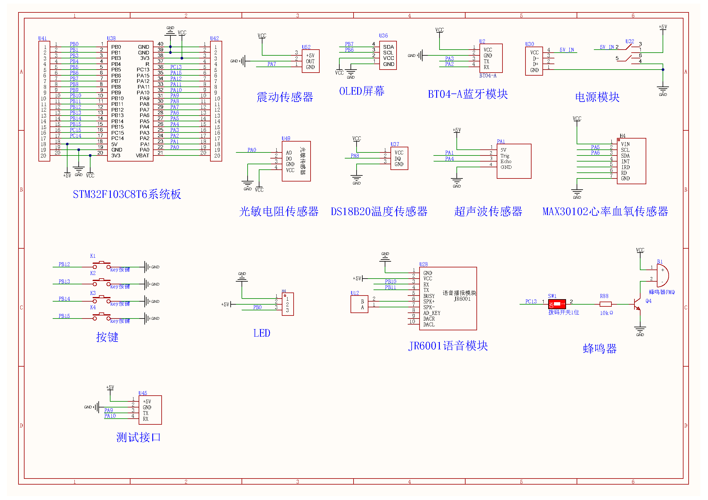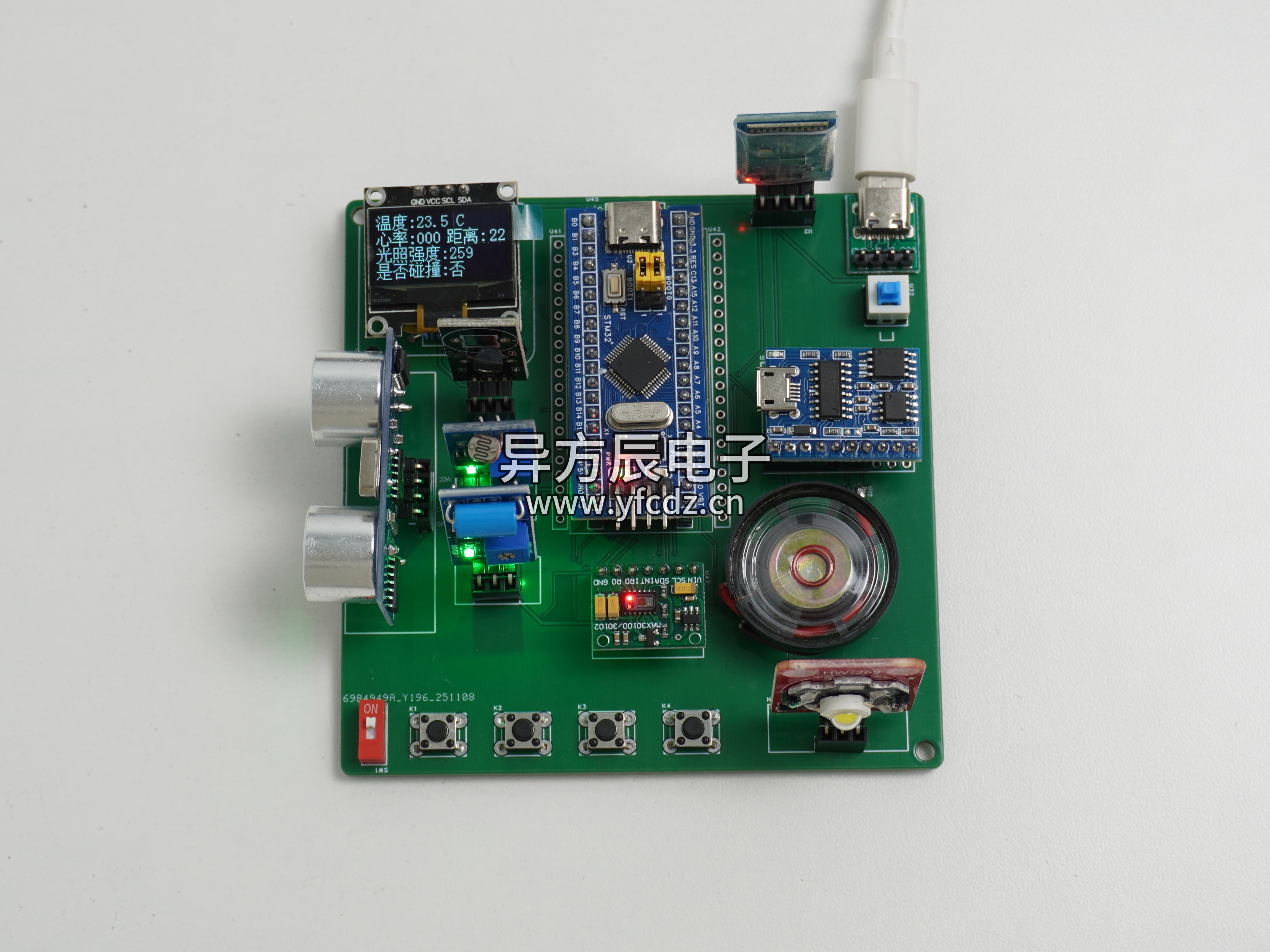 - 自动模式:自动模式下光照低于阈值开启照明灯;体温超过阈值蜂鸣器报警;心率超过阈值蜂鸣器报警、震动模块检测是否和前车发生碰撞,如果碰撞则语音播报"请注意安全";超声波检测与后方车辆距离,如果距离小于阈值则语音播报"请注意后方来车"