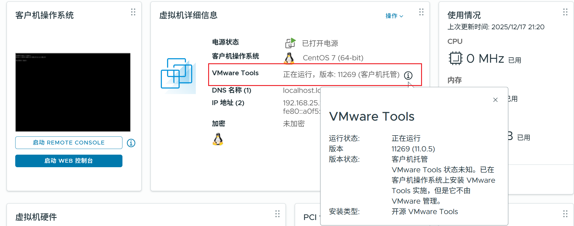 root@localhost \~\]# cat /etc/system-release ```clike CentOS Linux release 7.9.2009 (Core) ``` [root@localhost ~]# rpm -qa|grep open-vm-tools ```clike open-vm-tools-11.0.5-3.el7.x86_64 ``` **但是Rocky Linux虚拟机采用精简安装模式,系统没有自动安装open-vm-tools,如下** :  这时可以选择安装开源版本的vmtools或者vmware自带的。 1) 安装open-vm-tools 安装`open-vm-tools`很简单,一条命令就可以实现,但是需要重启生效。 dnf -y install open-vm-tools 查看版本 rpm -qa|grep open-vm-tools ```clike open-vm-tools-13.0.0-1.el9_7.1.x86_64 ``` ### 三、为Windows虚机安装vmtools 给windows虚机安装vmtools,就不像Linux那样可以直接下载开源版本了,而是直接安装自带的vmtools,在vmtools中自带了VMXNET的驱动,如果使用VMXNET的网络设备器,没有安装vmtools就无法使用。   进入虚机,点击安装光盘:  弹出安装程序,点击下一步直到完成即可。   重启虚机生效:  查看vmtools安装状态: