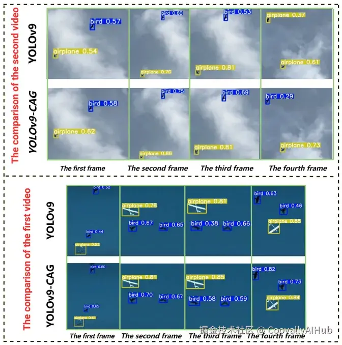 为了验证实际应用效果,研究团队在真实拍摄的可见光与红外视频上进行了测试。视频中的无人机和鸟类目标尺寸很小(40x40至80x80像素)。