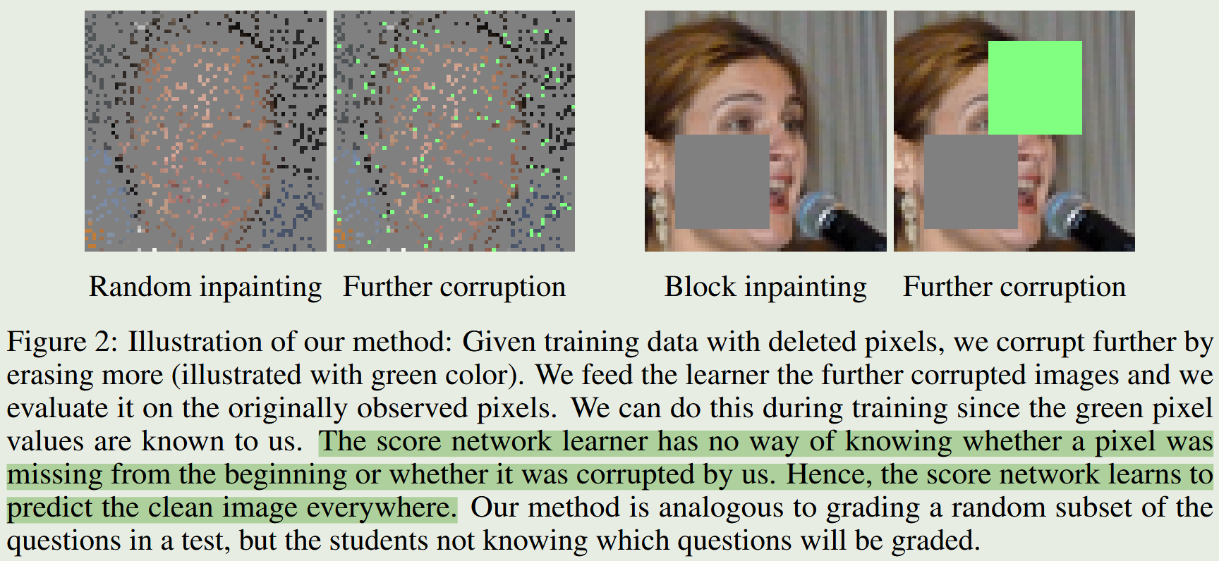 在这篇论文中,这一思路的具体落地就是引入的额外损坏 。对原始损坏样本 A x 0 A x_0 Ax0( A A A 是原始损坏矩阵),施加二次损坏得到 A ~ x t = B A x t \tilde{A} x_t = B A x_t A~xt=BAxt( B B B 是额外损坏矩阵)。模型只能获取 A ~ x t \tilde{A} x_t A~xt,但不知道哪些像素是原始缺失、哪些是额外损坏。为了不被损失惩罚,模型必须假设所有缺失像素都可能是额外损坏的(即原始样本中存在该像素),从而被迫学习这些像素的干净值。