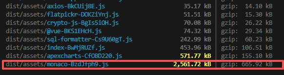 有些教程(官方也这么教)会教直接用import * as monaco from 'monaco-editor';来将整个依赖库导入,这样的后果就是打包出来的Monaco整整占用4MB(左图),而我们按需导入后体积骤降2.5MB(右图)
