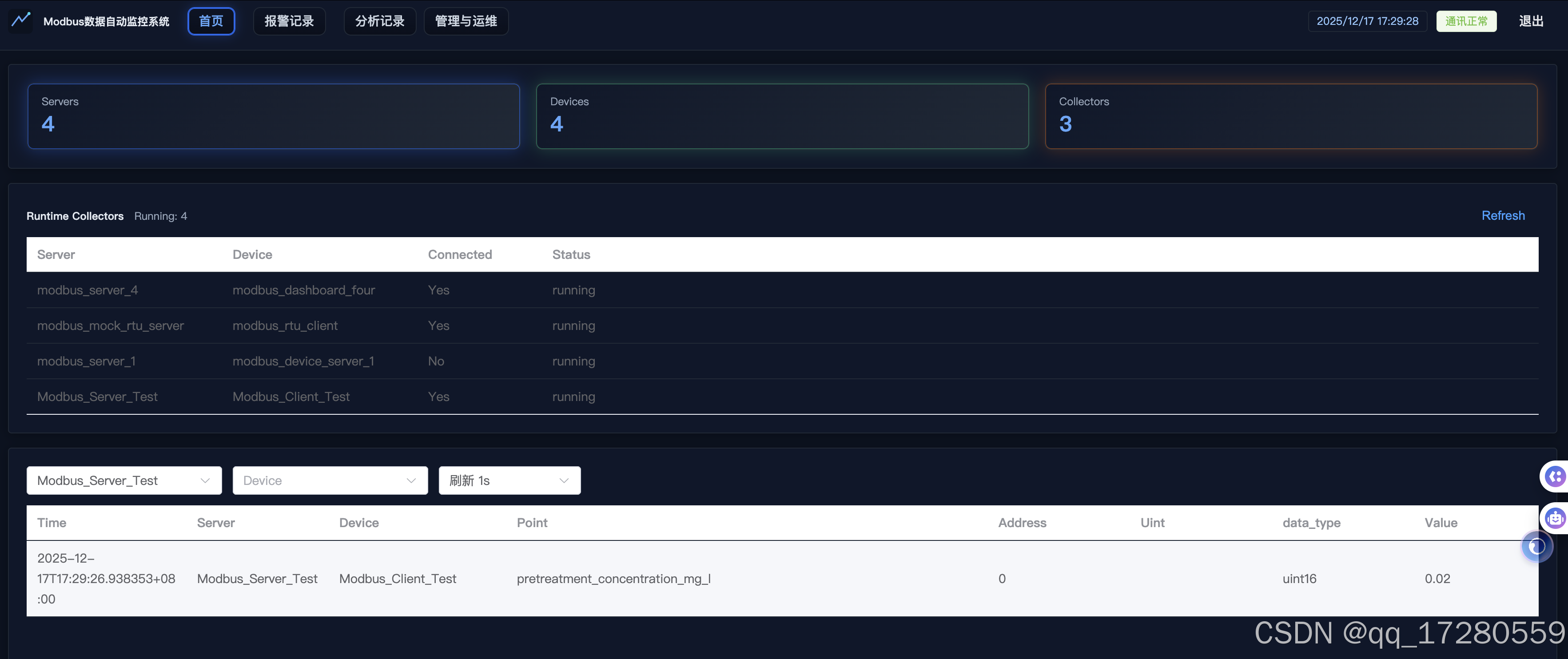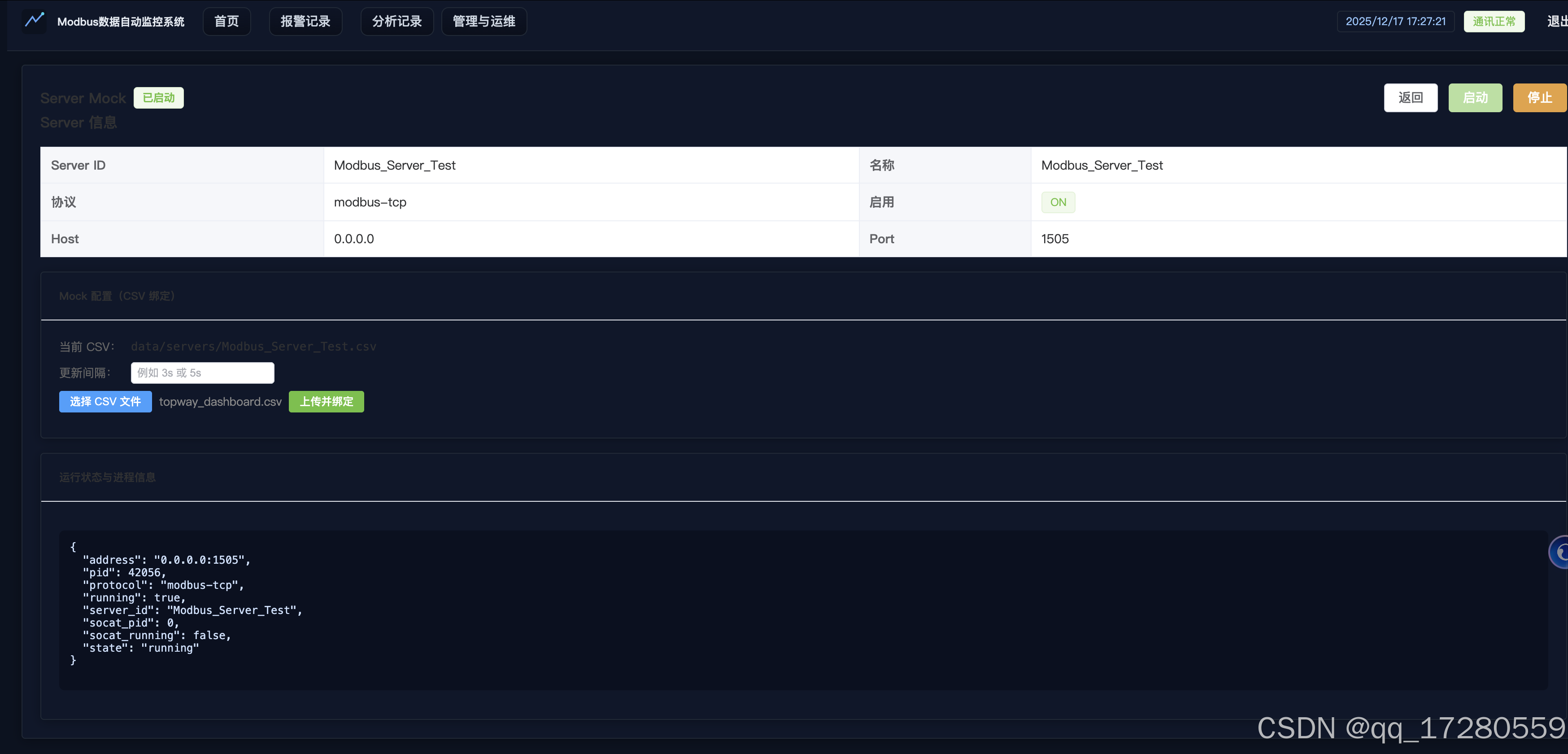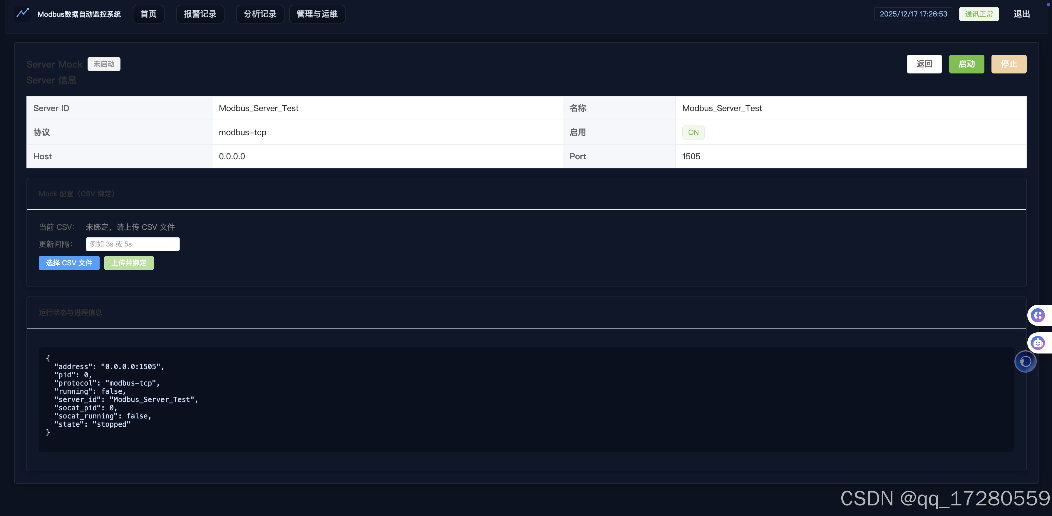 2、具备Mock启动功能:如果是真实存在的tcp/rtu的端口或者串口,无需这一个mock启动操作,如果是没有相关的服务或者串口,点击mock会基于Server的配置生成对应的TCP Server服务或者创建虚拟串口的RTU Server服务。(本篇只展示TCP,RTU还在开发中,RTU的数据链路未通)