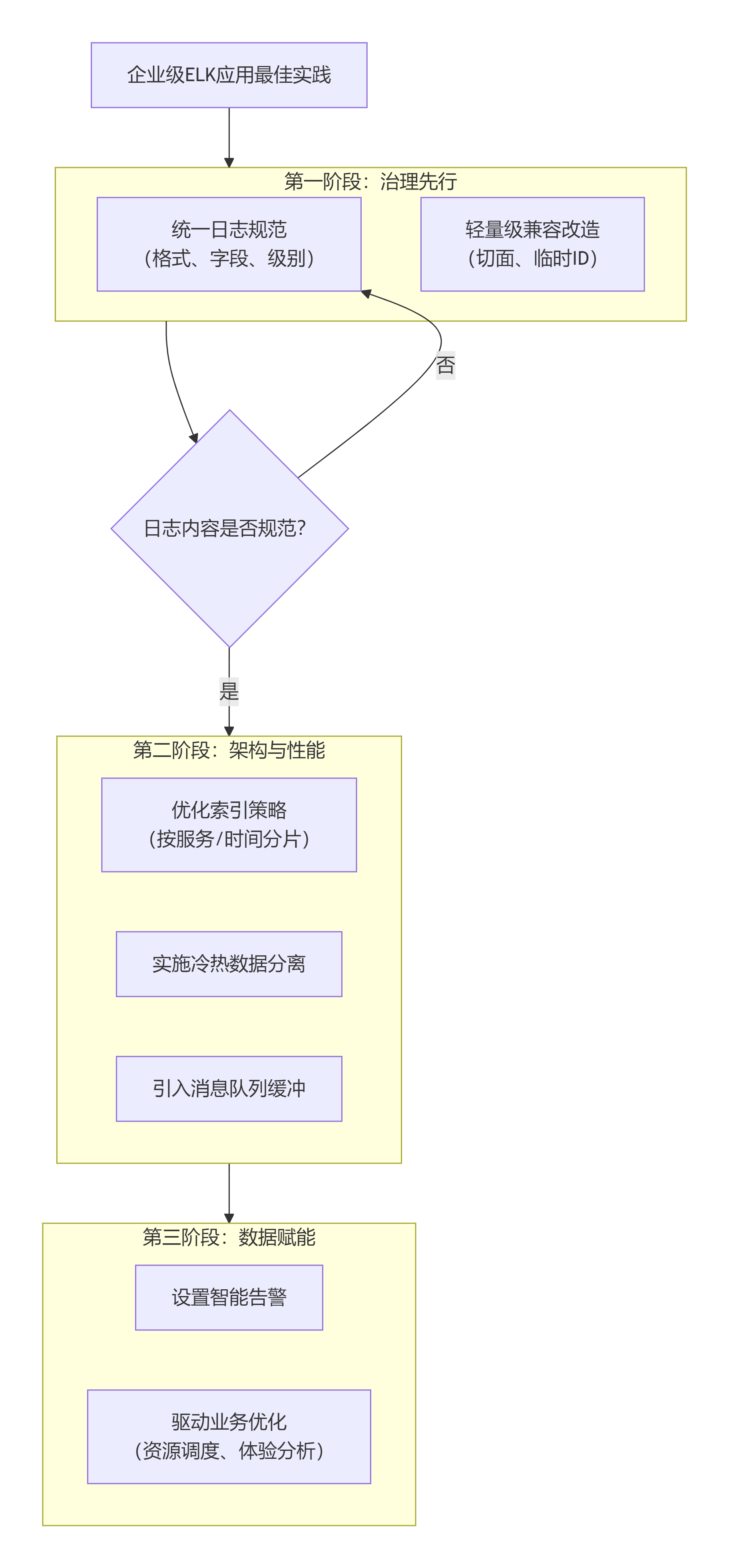 针对企业级ELK应用的最佳实践 ,其核心已从简单的"日志收集工具"演进为驱动系统稳定、赋能业务增长的工程体系。最佳实践可总结为:一个中心思想、三个关键阶段和六个核心实施要点。