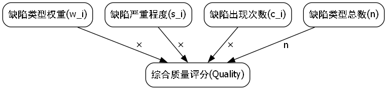 其中, Q u a l i t y Quality Quality表示综合质量评分, w i w_i wi表示第 i i i种缺陷类型的权重, s i s_i si表示第 i i i种缺陷的严重程度(0-1), c i c_i ci表示第 i i i种缺陷的出现次数(0或1), n n n表示缺陷类型的总数。