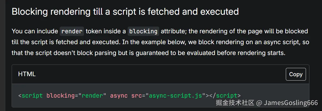 blocking: script 标签的 blocking 属性是 render 的时候,会让js下载完之后立即执行且下载和执行都可能会阻塞渲染但是不会阻塞HTML解析,因为需要等脚本执行了才能开始渲染