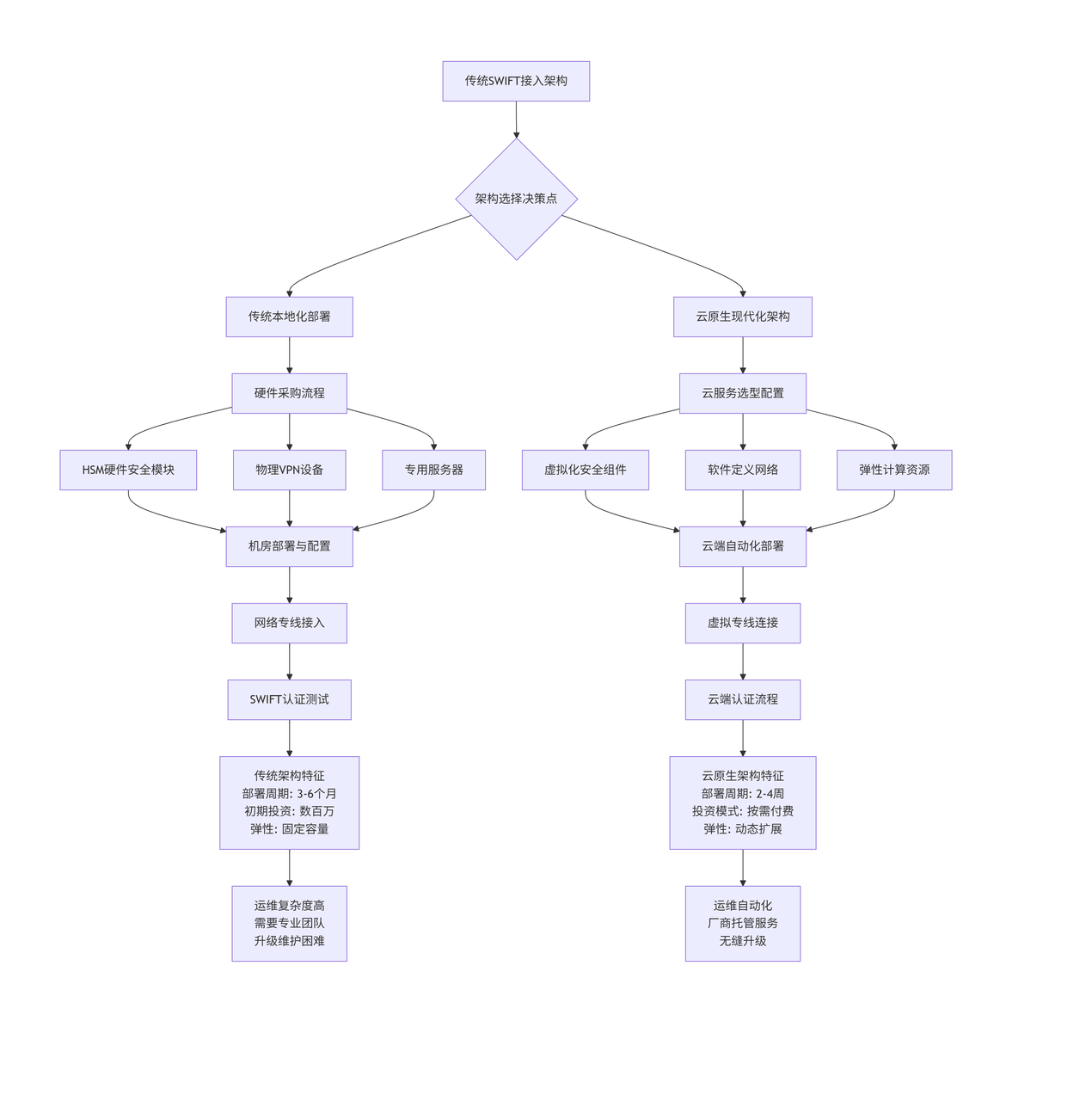 传统架构的核心痛点 主要体现在三个维度:首先是基础设施成本,专用硬件采购往往需要数百万人民币的初始投入,且设备更新周期短,持续投入大;其次是部署效率,从项目启动到正式投产通常需要3-6个月时间,包括设备采购、机房准备、网络专线申请、SWIFT入网认证等多个复杂环节;最后是运维复杂性,需要组建专业的运维团队,7×24小时监控系统状态,处理各种硬件故障和网络问题。