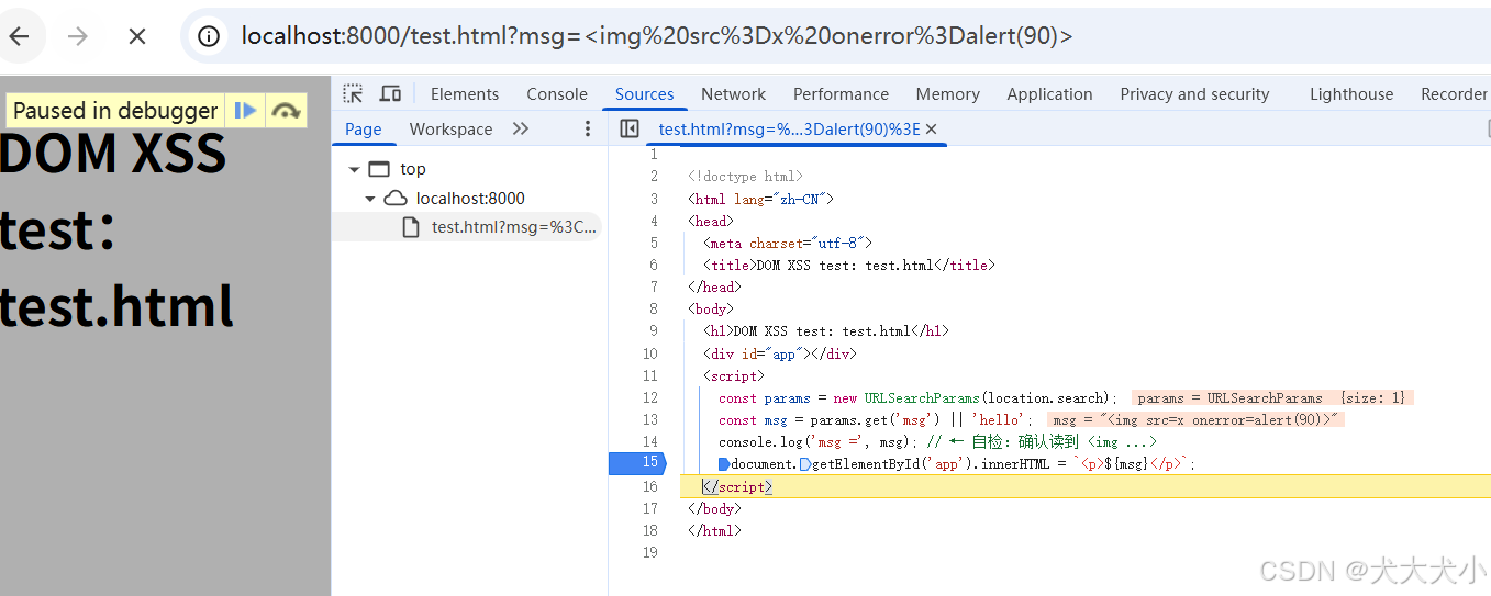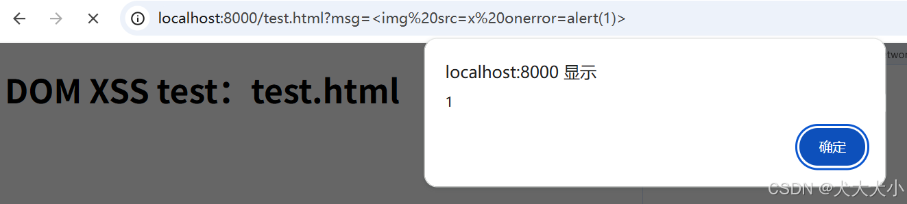3 浏览器访问 localhost:8000/test.html?msg=<img%20src=x%20οnerrοr=alert(1)>