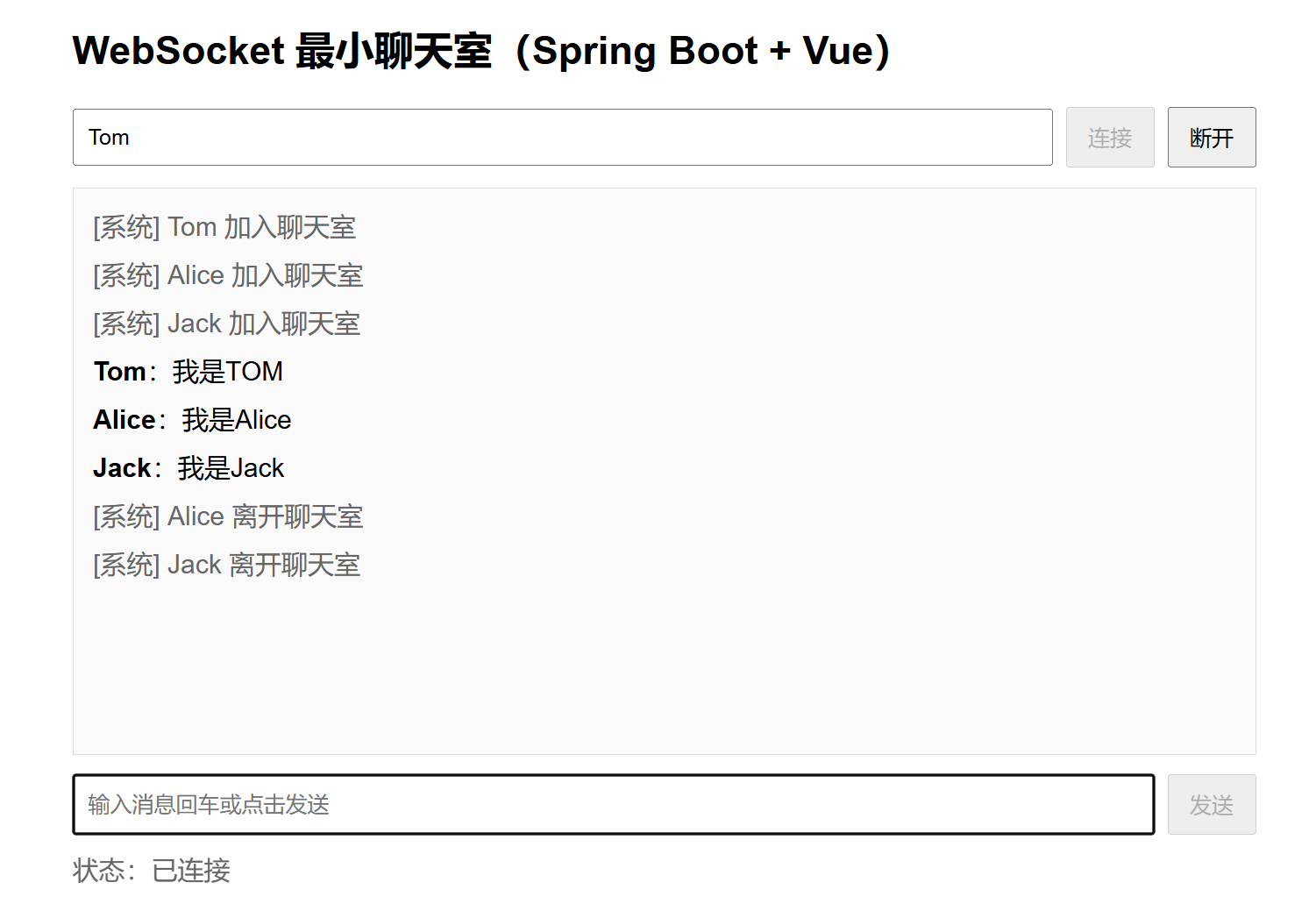 <h2>WebSocket 最小聊天室(Spring Boot + Vue)</h2>