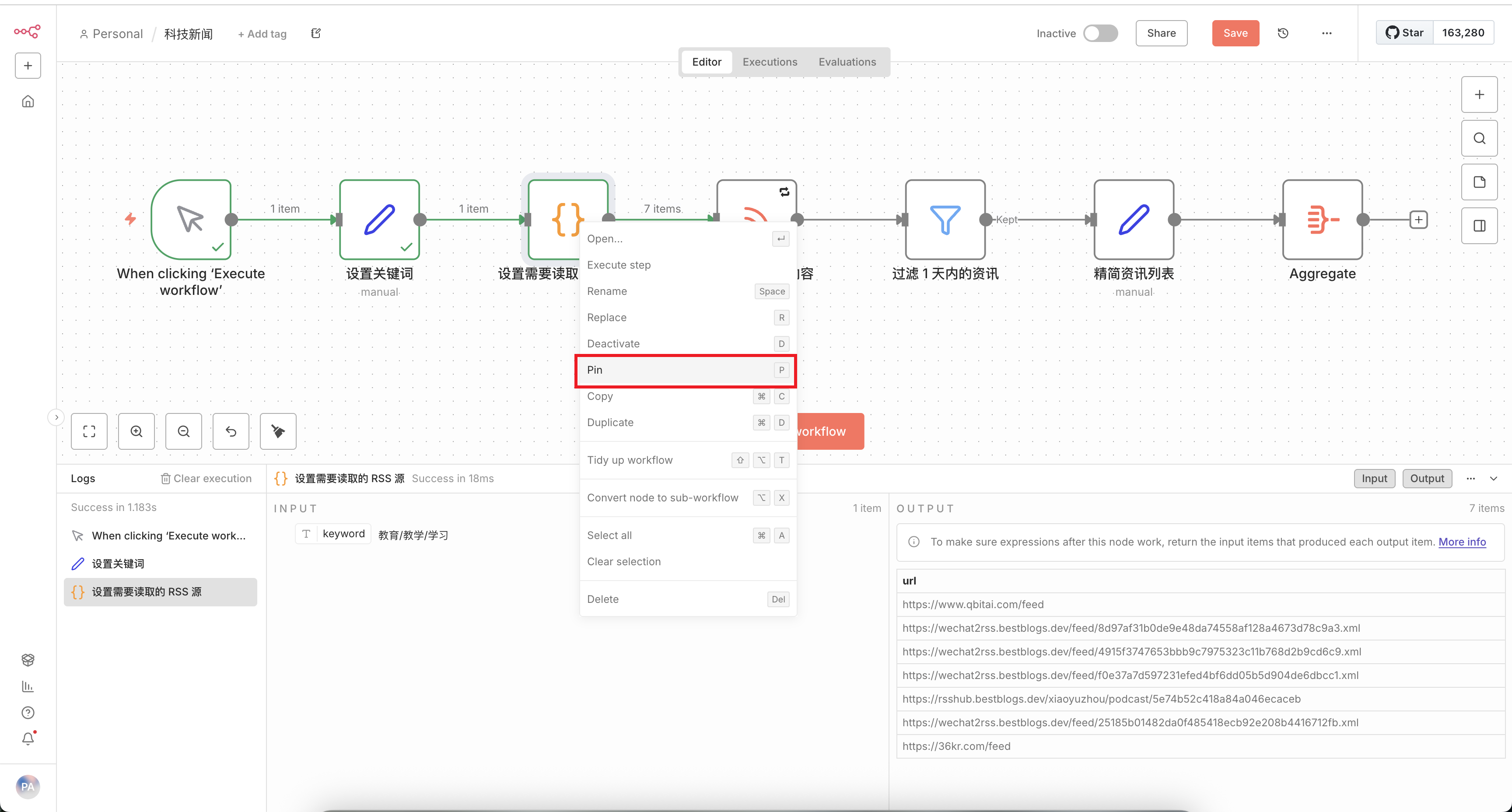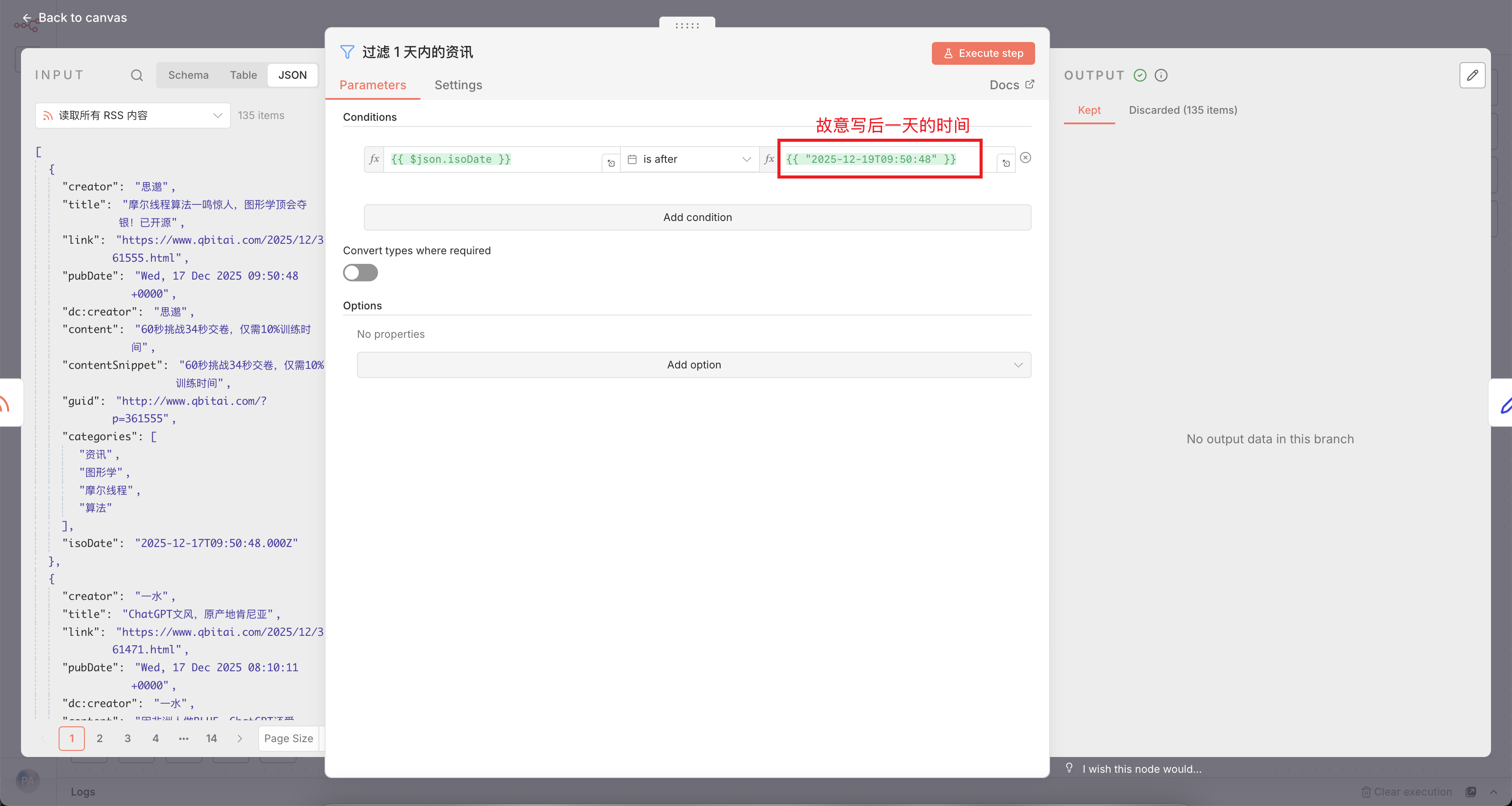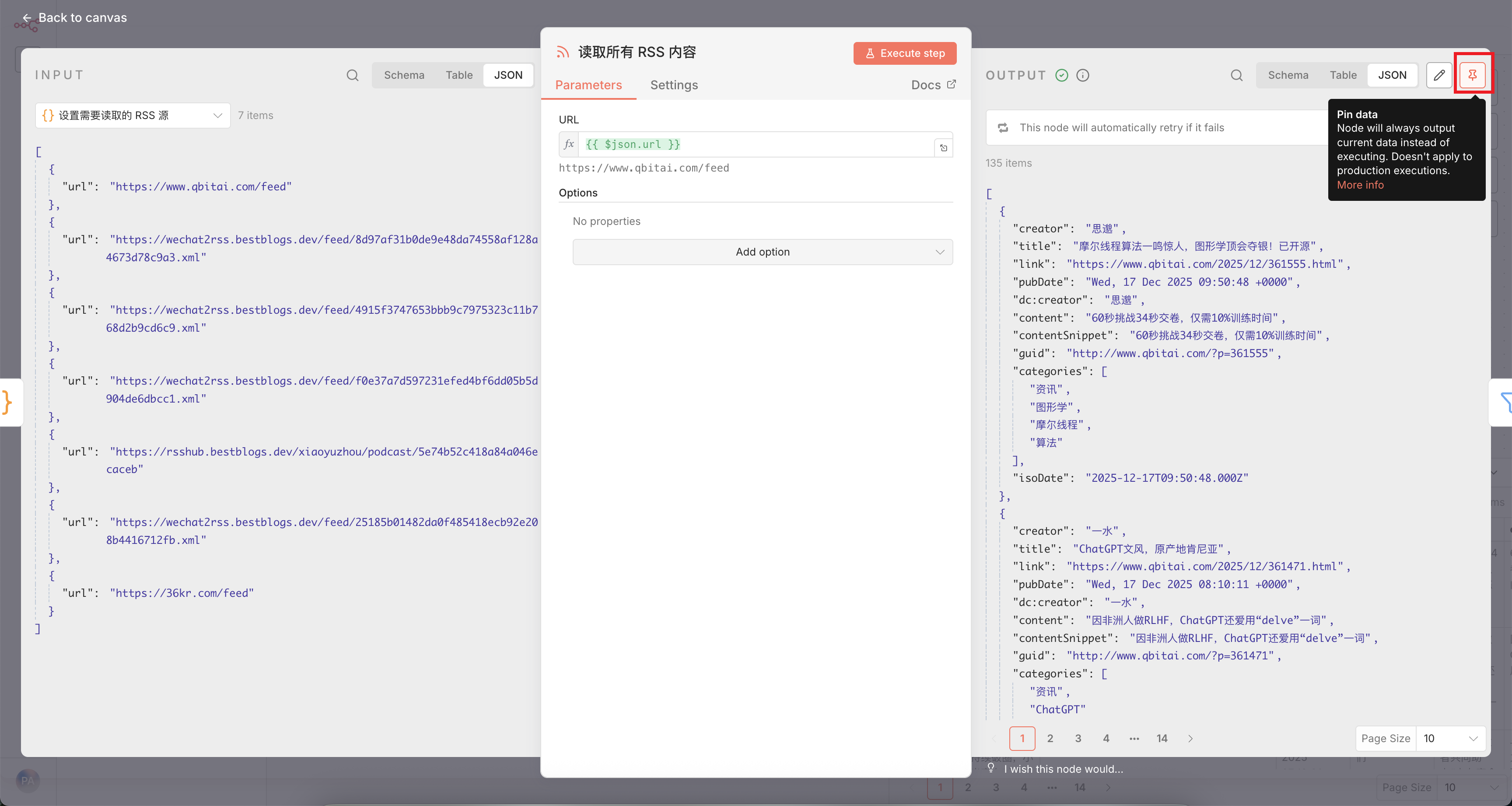 "读取RSS"节点获取大量数据后,需要传递给"过滤1天内"节点进行筛选。使用Pin功能可以清晰地查看中间数据的真实面貌。