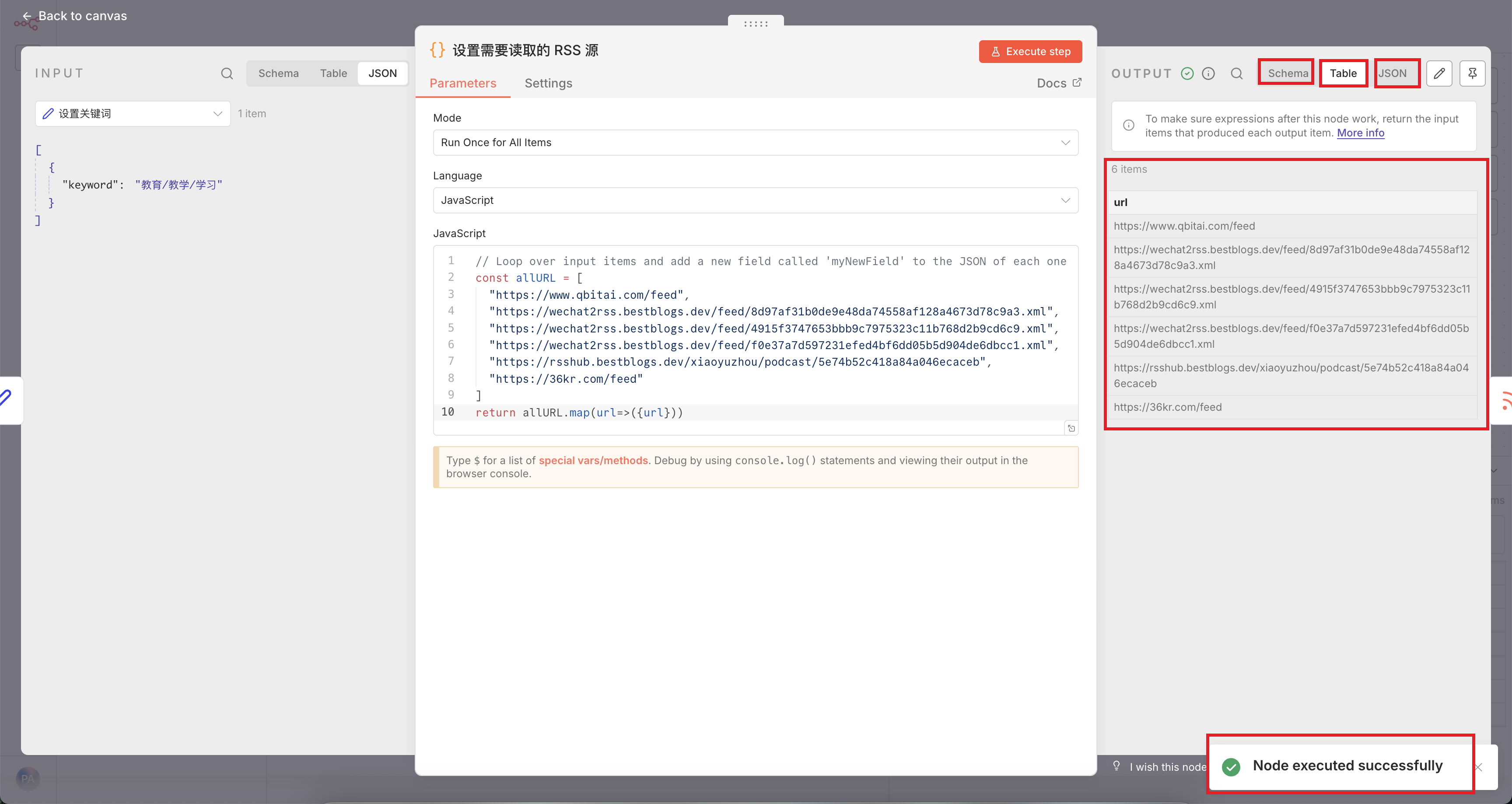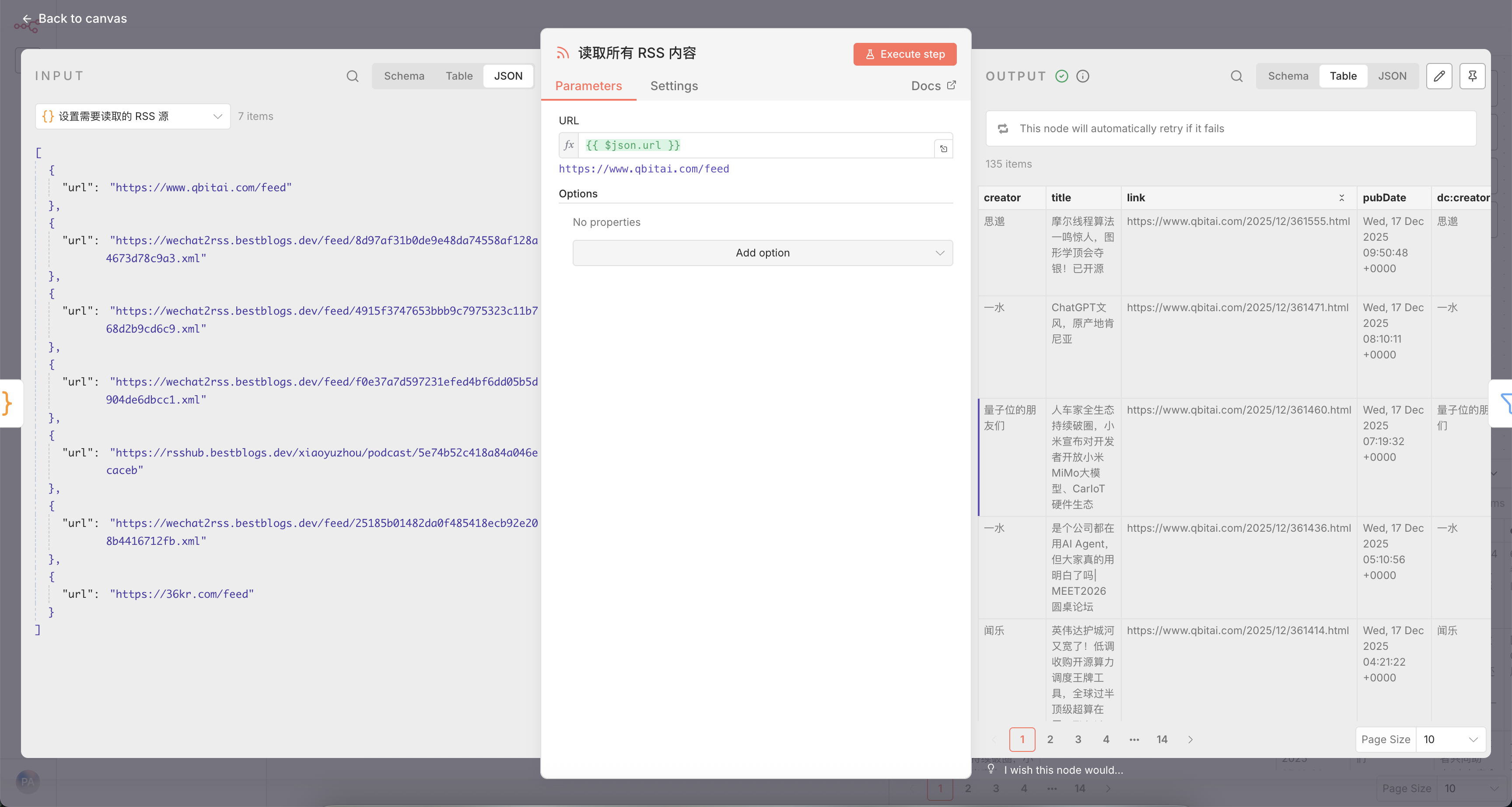 - 首先对"读取RSS"节点进行单节点测试,获取原始输出数据。