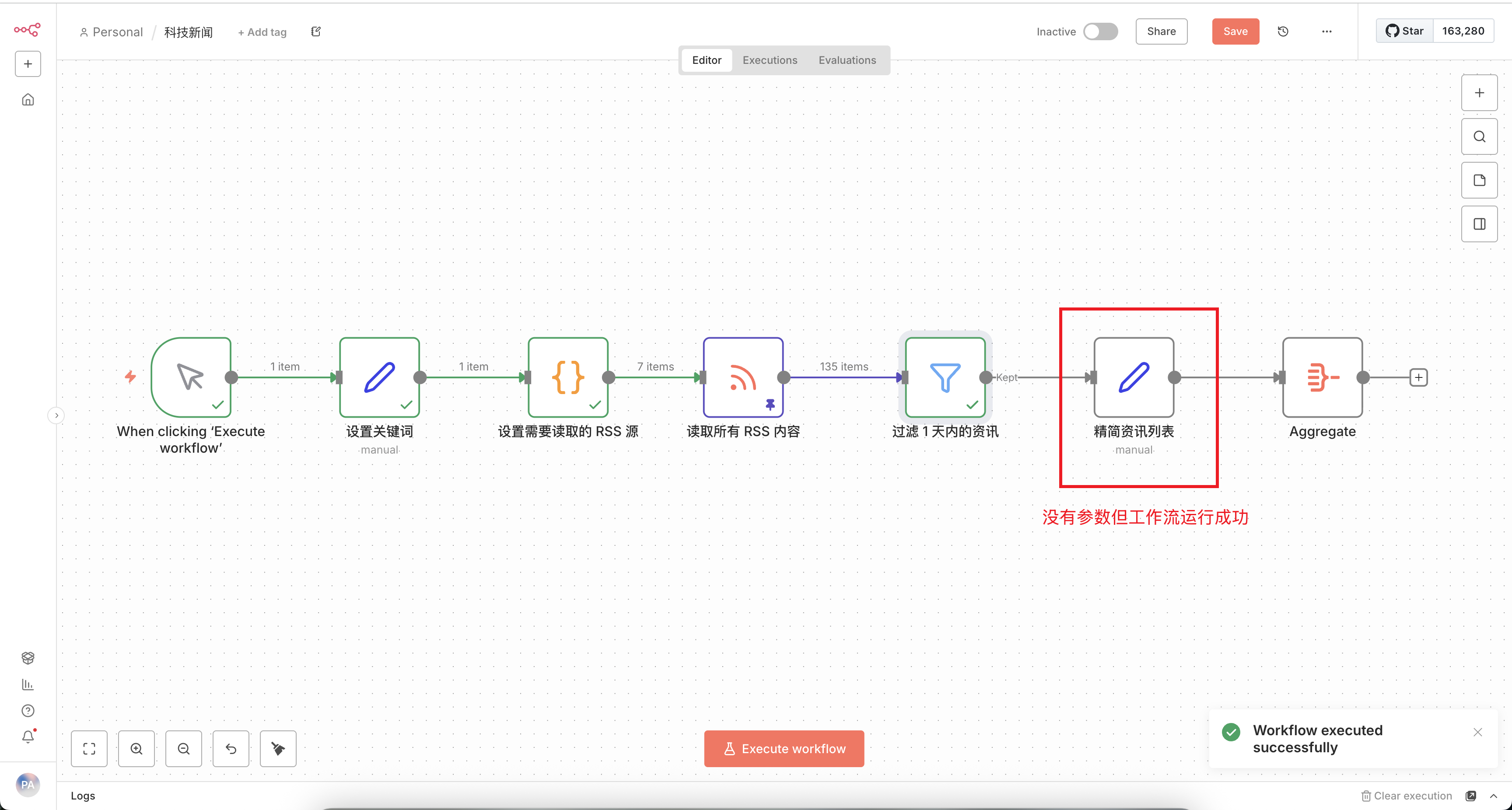 对于网络依赖型节点(如RSS Feed Read),先通过单节点测试确认其连接性和数据格式,避免网络问题掩盖了真正的逻辑缺陷。