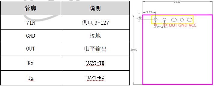 芯片感应距离范围正向1至14米,默认2米,发射功率小于5dBm,工作频率范围5.725GHz至5.875GHz,工作电压3V至5V,工作温度零下20至85摄氏度。模块集成感光检测功能,可调节感光强度,输出信号支持IO或PWM,输出电压0或3.3V,输出延时1秒。