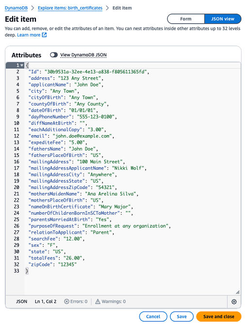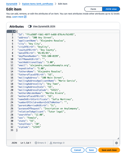 已构建所有必要资源、权限和代码,可开始测试解决方案:在 S3 的 birth_certificates 文件夹上传两张扫描图像,打开 DynamoDB 控制台浏览 birth_certificates 表,配置正确则几秒内会出现两个项目,西班牙语表格的键和标签会被 Anthropic Claude 3 自动翻译成英语