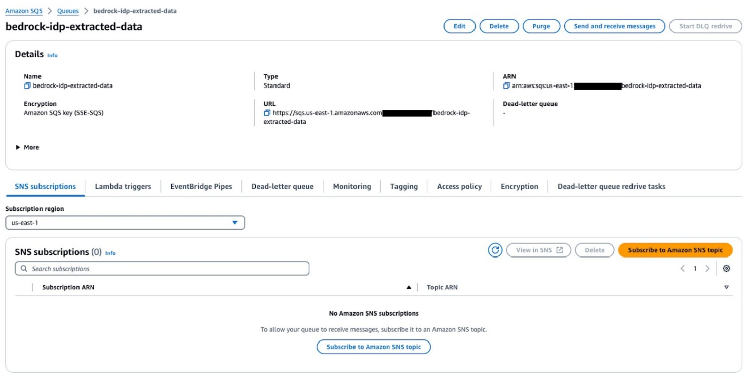 在 Amazon SQS 控制台中,创建一个标准队列类型的队列,输入队列名称(例如 bedrock-idp-extracted-data),其他设置均保留默认值