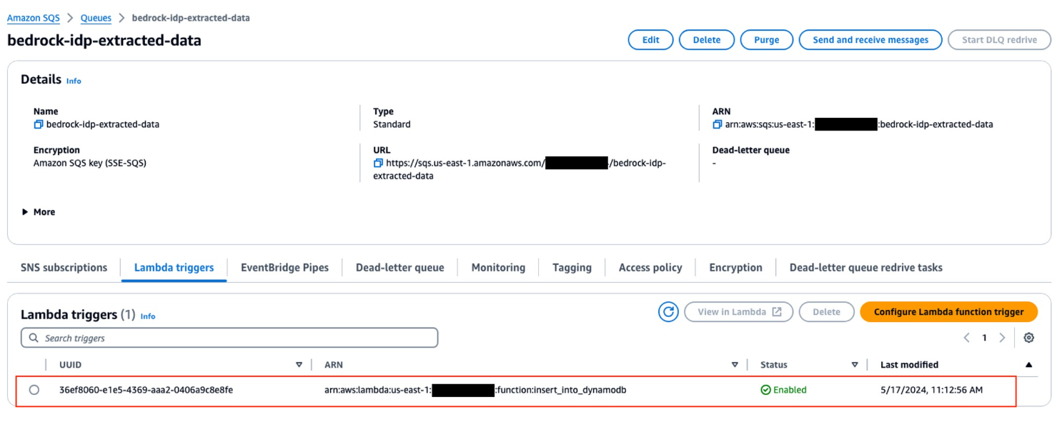 Amazon SQS 控制台打开 bedrock-idp-extracted-data 队列,在 Lambda 触发器选项卡点击配置 Lambda 服务触发器,选择 insert_into_dynamodb Lambda 服务后保存