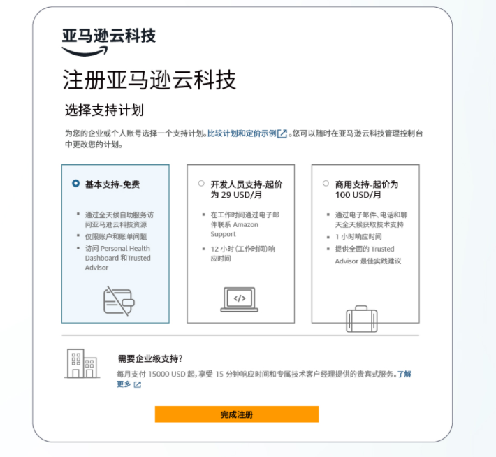 售后支持:免费计划自动获基本支持,付费计划需选支持计划(各计划都含客户服务,可访问文档白皮书,按需选后点 "完成注册",若需企业级支持可了解付费升级选项,确认选好即可完成整个注册流程 )