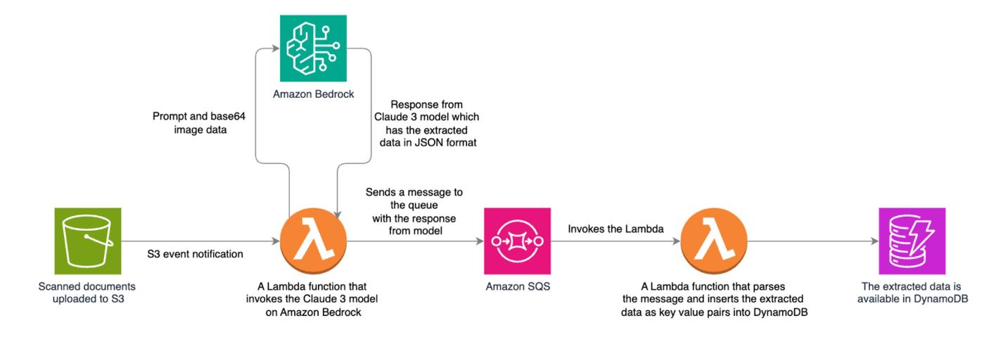 - 模型调用层:Lambda 函数接收事件后,向Amazon Bedrock(搭载 Anthropic Claude 3 模型)发送包含提示词和 base64 图像数据的请求,模型返回 JSON 格式的提取数据