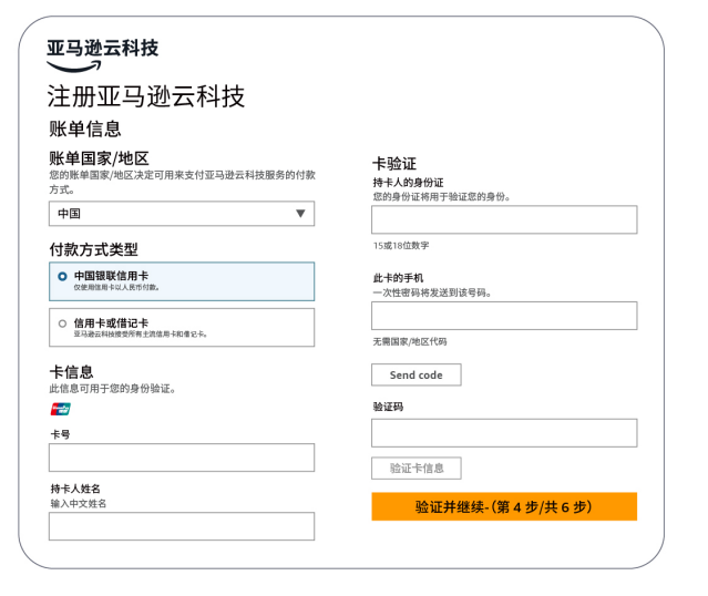 绑定相关信息,选择国家地区,点击"Send code"收验证码填写,勾选同意协议后,点击"验证并继续"进入下一步