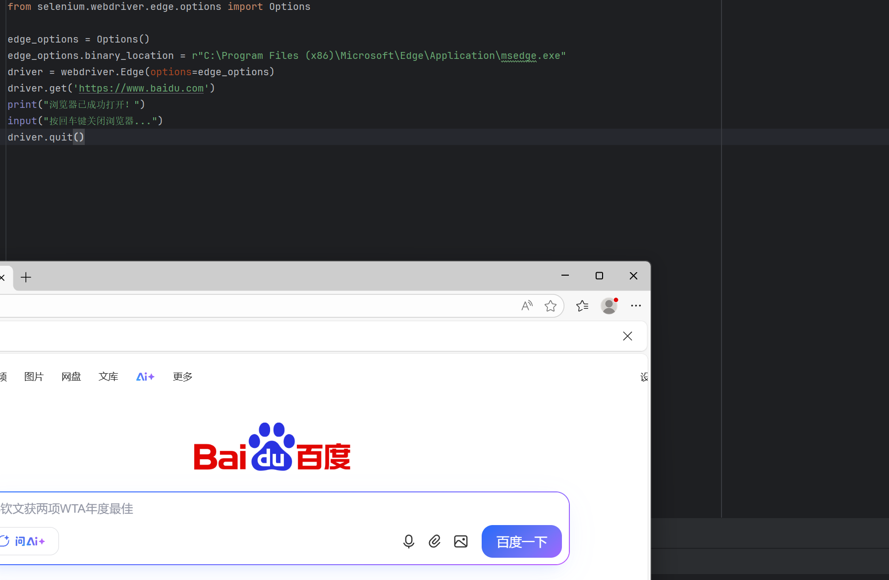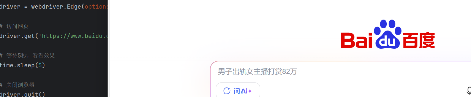 通过配置并启动Edge浏览器驱动并访问百度识图的上传页面后,使用Selenium的find_element方法通过By.NAME定位属性名为file的文件上传输入框元素,随后调用send_keys方法将待上传图片的完整本地路径输入至该元素,从而触发文件上传流程;上传后通过短暂等待确保识别完成,再利用By.CLASS_NAME定位到显示识别结果的元素,获取并打印其文本内容,最后就完成了从网页上传图片到获取识别结果。