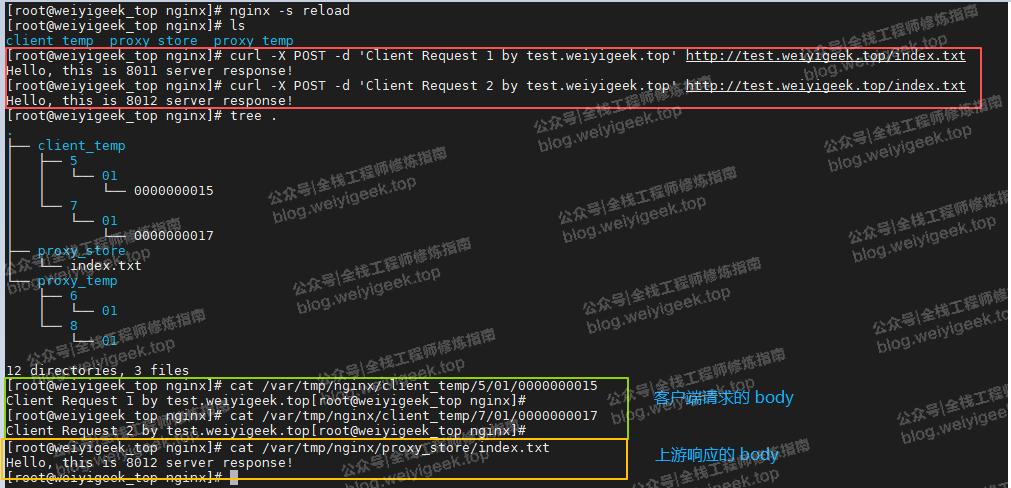 步骤 04.配置完成后先执行 nginx -t 检查配置文件语法正确性,然后再执行 nginx -s reload 重新加载配置, 最后使用 curl 命令测试客户端上报的 body 以及 上游响应的 body 是否持久化存储到磁盘文件中。