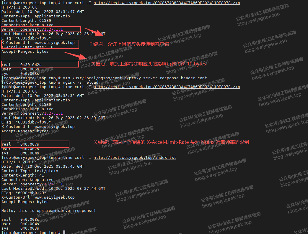 # 启用或禁用上游响应的 X-Accel-Limit-Rate 头部字段验证其效果