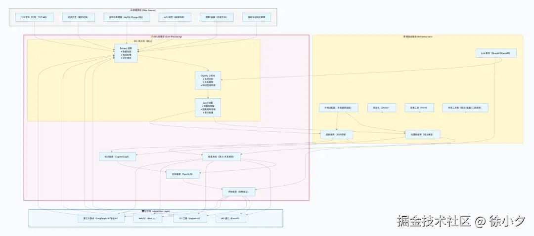 我个人结合 Cognee 的 ECL 核心流水线、模块化设计以及数据处理逻辑,画了一个详细的架构设计图,大家感兴趣的可以参考一下:
