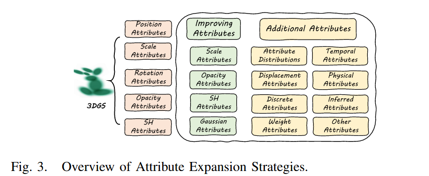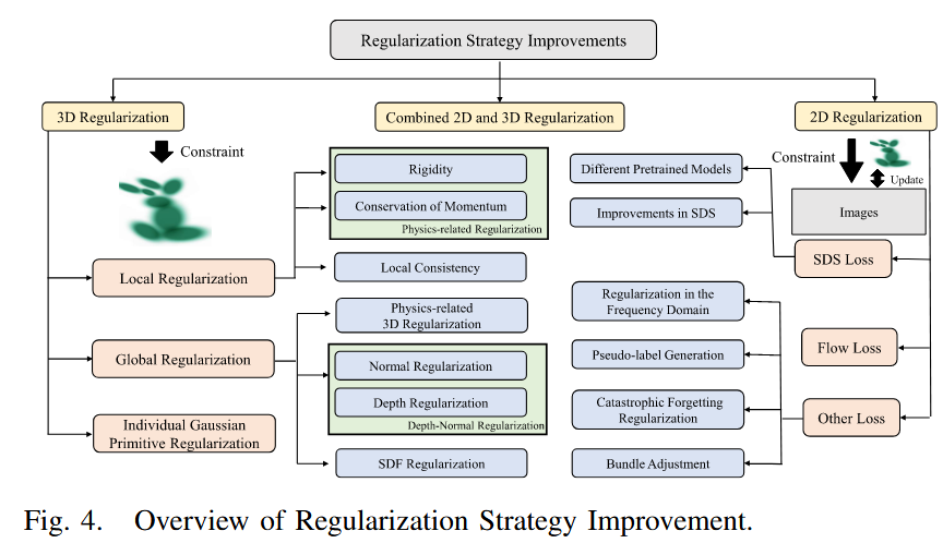 208\]2D风格模块+3D颜色模块一致。 * 4) Animation SC-GS\[181\]动画稀疏控制点。BAGS\[142\]视频SDS动画。 分析:编辑如"3D Photoshop",SDS泛但不稳,多视图编辑一致性关键。与NeRF比,3DGS易操作但需防伪影。 ### D. Relightable 解耦纹理/光\[210\],\[211\]:Relightable 3D Gaussian\[210\]点+法线/BRDF/分解光。GS-IR\[211\]类似。GaussianShader\[32\]混色+GGX+残差。 OLAT-GS\[212\]衰减光+入射+散射。GS³\[213\]空间/角高斯+三溅射+神经网自影/全局光。 分析:比vanilla强在反射/复杂光,但透明/材料难。未来:逐像素着色扩展。 ### E. Semantic Understanding 用预训2D模型监督语义属性\[214-217\]。Feature 3DGS\[215\]联合特征场+光栅化下游任务。 文本-视觉对齐\[220-222\]:\[220\]CLIP/DINO\[223\],\[224\]特征离散VQ\[225\]。FMGS\[222\]多分辨哈希编码\[226\]减维。 分析:语义如"3D标签",增强检测/分割。与前作比,3DGS显式易扩展,但多视图一致/开世界难。 ### F. Physics Simulation PhysGaussian\[227\]3DGS离散场景+连续介质力学+MPM\[228\]求解。PhysDreamer\[229\]类似。VR-GS\[230\]交互模拟VR。 分析:桥接模拟/渲染,但计算重。未来:加物理属性如速度/力。 ## VI. 3DGS COMPONENTS AND IMPROVEMENTS 这一节是论文的技术核心,系统总结了vanilla 3DGS的九大模块改进:初始化、属性扩展、溅射、正则化、训练策略、自适应控制、后处理、与其他表示整合、额外先验(如图3、4、5所示)。动机在于帮助研究者理解这些模块的共性,并自定义优化以适应特定任务。背景:3DGS的显式结构便于模块化改进,但需平衡效率与真实度。 分析:这个节像"3DGS的工具箱",每个模块的升级都能解决特定痛点。与前作综述不同,本文强调跨任务技术复用,比如初始化改进能提升稀疏视图重建的稳定性。为什么重要?它提供"原子级"指导,让新人从基础构建高级变体。 ### A. Initialization 核心观点:初始化决定优化起点,SfM稀疏点或随机点常不可靠,尤其弱监督下。动机:避免训练不稳,捕捉低频信号。背景:传统方法依赖高质量SfM,改进引入先验提升鲁棒性。 关键方法: * 预训模型\[50\],\[96\],\[97\],\[101\],\[61\],\[126\],\[127\]:用少量3D样本预训模型初始化,或单目深度估计提供位置先验。创新:如\[96\]加扰动点补几何完整性。解决:数据限下不稳。 * 策略改进\[231\]:稀疏-大方差初始化,SfM捕低频,随机大方差补高频。 * 其他表示\[232\],\[63\],\[77\],\[79\],\[212\],\[233\]:用Visual Hull\[63\]、FLAME\[77\]、Mesh\[79\],\[212\],\[233\]初始化,提供结构几何先验。如\[232\]局部体积初始化少量高斯,避免过度假设。 分析:初始化如"种子",好种子长好树。比vanilla随机强在防局部最优,但牺牲效率。与NeRF比,3DGS易整合先验,但未来需减初始化依赖,如自适应初始化。 ### B. Attribute Expansion  核心观点:原属性(位置、缩放、旋转、SH、不透明)可改进或新增,提升任务适应。动机:让3DGS更灵活,如表面重建或动态。背景:扩展像"升级硬件",但增存储需压缩。 #### 1) 改进现有属性 * 缩放:压扁z缩放\[24\],\[91\],\[185\],\[192\],\[194\],加深度/法线监督表面化;限主/次轴比\[148\],\[227\],\[234\]防瘦内核伪影。 * SH:哈希网格+MLP压缩\[12\],减存储。 * 不透明:趋0/1\[32\],\[185\]清表面。 * 高斯:用GEF混合\[15\]替换(β=2为原3DGS),提升表示效率。 #### 2) 新增属性 * 语义\[145\],\[146\],\[158-160\],\[215\],\[218\],\[219\],\[235\]:加语义监督,提升SLAM/编辑。身份编码\[214\]分组实例。 * 分布\[43\],\[99\]:位置/缩放分布防局部最小。 * 时序\[138\],\[145\],\[183\],\[184\]:时SH/4D属性动态化,用傅里叶基函数\[145\],\[183\]。 * 位移\[43\],\[171\],\[172\]:无条件精炼粗属性;条件如时步t\[171\],\[172\],\[173\]、表情\[39\],\[69\],\[75\],\[78\],\[82\],\[83\],\[84\],\[85\],\[191\]预测变形。 * 物理\[32-34\],\[174\],\[212\],\[213\],\[175\]:漫反射/镜面/残差色/阴影/各向异性SH处理反射/光照;速度\[175\]瞬态。 * 离散\[8-10\],\[12\],\[115\],\[179\],\[220\]:VQ码本索引压缩;运动基系数\[179\]。 * 推断\[10\],\[28\]:参数敏感性\[10\]导压缩;像素覆盖\[28\]导多尺度采样。 * 权重\[181\],\[232\],\[233\],\[236\]:结构表示如局部体积\[232\]、RBF\[181\]、Mesh\[233\]、SMPL\[236\]计算查询点权重。 * 其他\[57\],\[150\],\[220\],\[155\]:不确定性\[57\],\[220\]稳训练;ORB特征\[150\],\[155\]对应。 图3描述:概述扩展策略,分类改进/新增,展示语义/时序等分支。 分析:扩展如"加插件",语义属性比vanilla强在物体边界准,但增存储(如高维CLIP特征\[220-222\]用哈希编码减维)。重要性:跨任务通用,如物理属性桥接模拟/渲染。未来:平衡扩展与压缩。 ### C. Splatting 核心观点:溅射将3D高斯高效转2D图像。动机:提升效/性能平衡。背景:传统EWA限局部近似/采样。 方法:\[237\]径向投影+单位球栅化适鱼眼/全景相机;\[31\]像素窗logistic积分防锯齿;\[238\]GPU射线追踪半透明粒子。 排序\[26\]:逐像素分层防弹出,减50%高斯、速1.6x、存2x。 分析:溅射如"画笔",改进权衡复杂场景/相机。研究少,未来需高效复杂模型支持。 ### D. Regularization 核心观点:正则防过拟合,分3D/2D(如图4)。动机:约束属性优化,尤其欠定问题。  #### 1) 3D正则 * 个体:改进高斯属性\[24\],\[79\],\[123\],\[227\],\[234\]。 * 局部一致:语义\[214\],\[216\],\[220\]、位置\[122\],\[137\]、时间\[180\]等;物理如局部刚性/旋转相似/长时等距\[130\],\[132\],\[167\],\[174\],\[179\],\[181\],\[191\],\[232\],\[142\],\[176\],\[180\]。 * 全局物理:深度-法线一致\[32\],\[187\],\[192\],\[193\];法线自监督\[186\],\[32\],\[187\],\[188\]或模型估计\[192\];