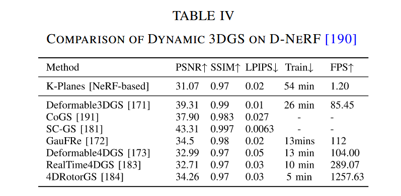 表格IV(D-NeRF数据集):Deformable3DGS PSNR 39.31, FPS 85.45;4DRotorGS 5min训,1237FPS。含义:4D表示高效动态。