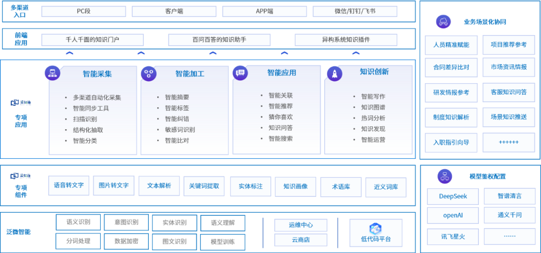 泛微·采知连数智化知识管理系统打造动态知识仓库 ,支持全渠道数据采集与合规管控。系统通过智能关联业务实现自动更新优化,确保DeepSeek大模型在安全合规的环境中持续迭代。该系统可为企业构建"智能助手"和"虚拟员工",为组织用户提供知识赋能和创新服务。