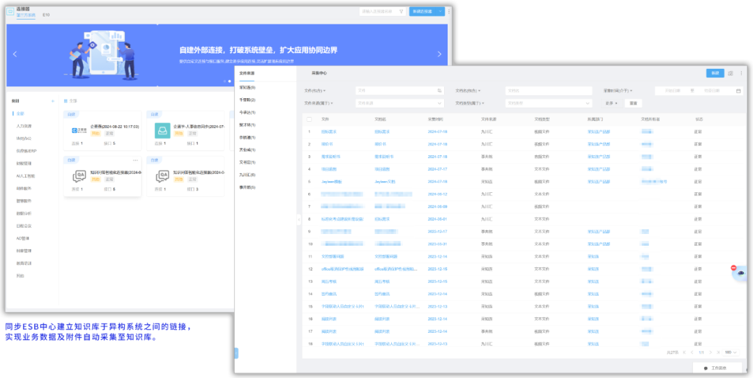 2)集成中 **心:**通过集成中心打通业务系统和知识仓库的连接,自动采集业务系统中的相关附件、工作记录等。