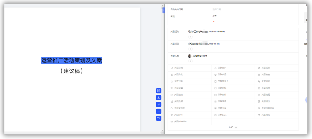 1)关联业务: 采知连知识管理系统可根据知识的来源可自动建立与业务之间的关联关系,如相关项目、相关任务、相关客户、相关资产等,在提供智能化服务时可以结合业务关联属性保障语料的相关性。