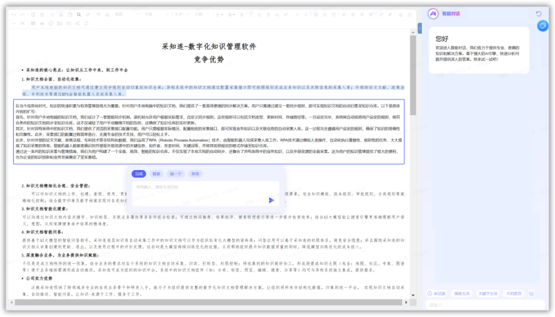 2)智能编写助手: 结合业务需求应用DeepSeek能力提供专业文档智能编写服务,整合产品运营过程所沉淀的知识资源,如最新的品牌介绍、售前方案、销售工具等等,将这些知识给到DeepSeek,模型会自动分析专项产品和其他市场同类竞品的差异 ,从而生成新的产品竞争优势说明。