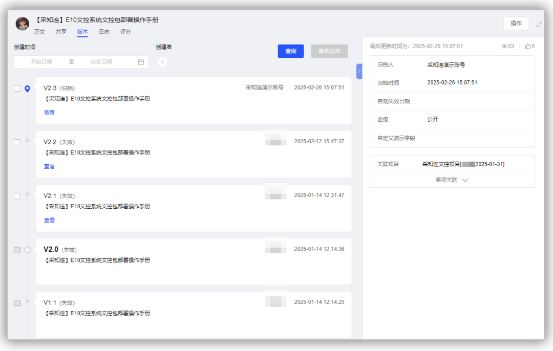 2)自动更新: 采知连知识管理系统可结合组织自身业务对知识文档实现全生命周期管理,如和项目管理系统集成,自动同步更新最新工具,自动收集最新案例、过期模版自动废止等,以此保障投喂给到大模型的语料时效性与准确性。