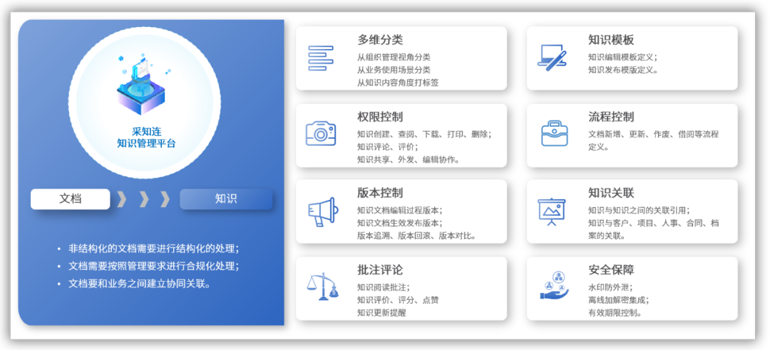 **1)安全保障:**采知连提供知识文档全周期的安全保障机制,包含密级定义、受控范围、有效期限、敏感信息识别处理等。
