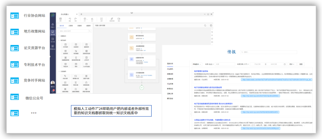 **3)RPA机器人:**通过RPA采集机器人连接外部的有价值的知识来源,对公众号中的文章、论文文献、政策法规等自动采集。