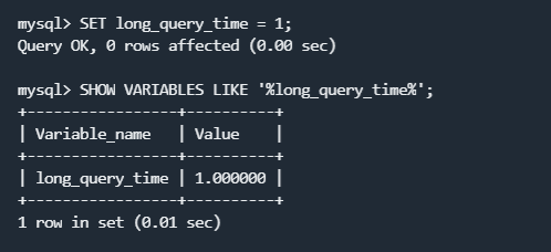 可通过SET long_query_time = 1;命令修改慢查询的拦截时间,比如说设置成1s。