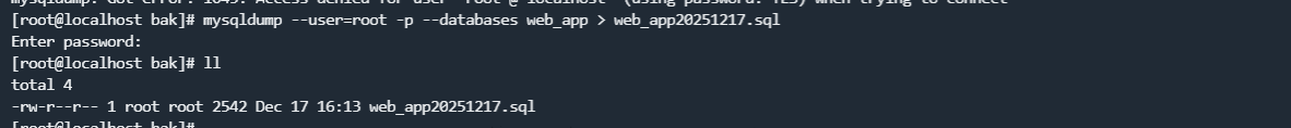 备份该数据库,执行命令:mysqldump --user=root -p --databases web_app > web_app20251217.sql