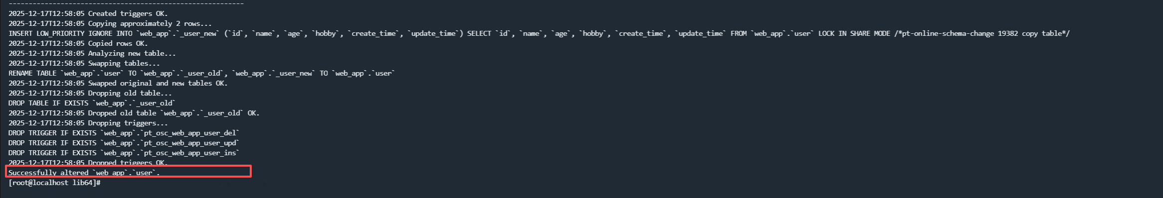 其实和第二点是一样的,使用Online DDL或者pt-online-schema-change 工具,这里不做过多介绍,直接上操作: